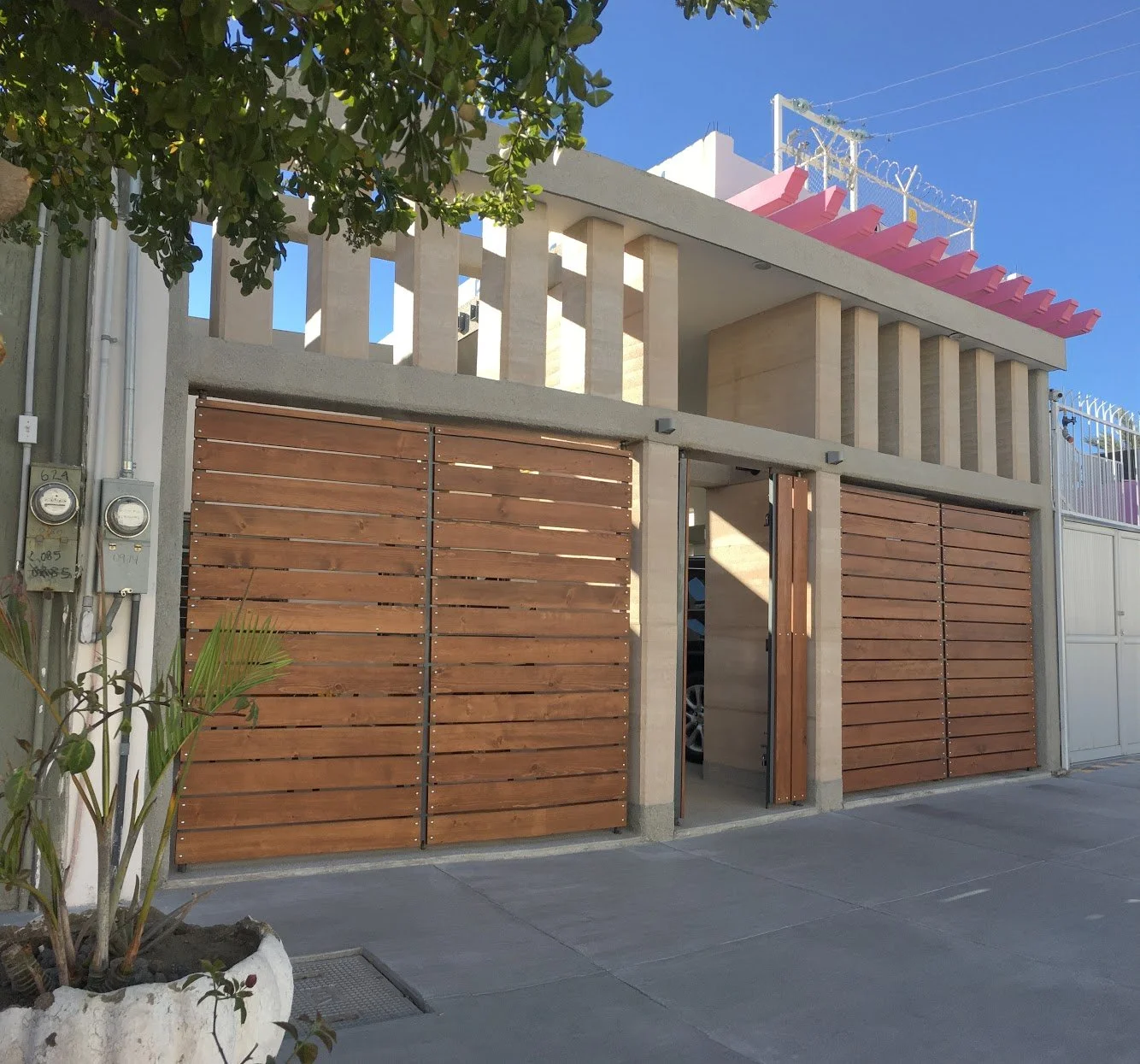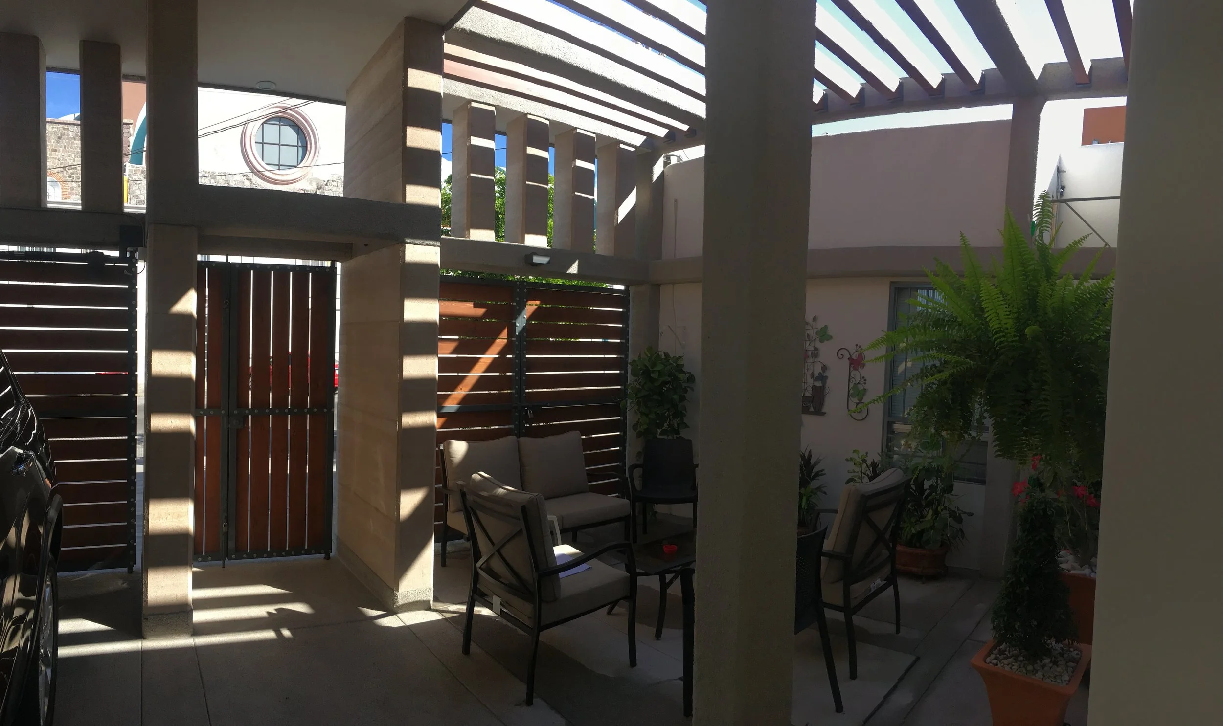Intervención cálido moderna en casa habitación, acceso armónico por un par de Muros de Tierra Compactada paralelos entre sí, acompañados en una media altura extra de una celosía del mismo sistema constructivo.